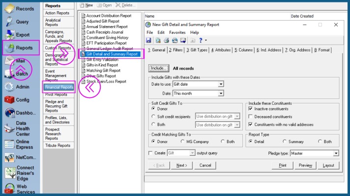 If you're only going to run one report out of database view, make it the Gift Detail and Summary Report. The detail version of this report provides detailed information (name, address, contact information) about a constituent's giving within a specific date range. The summary version of this report totals gifts within a specific date range by constituent code, campaign, fund, and/or appeal. In the RE menu bar click Reports. Click Financial Reports. Select Gift Detail and Summary Report. Click the new button.